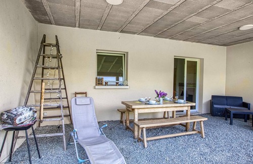 Modern and family-friendly vacation apartment with a large terrace and a view of nature.