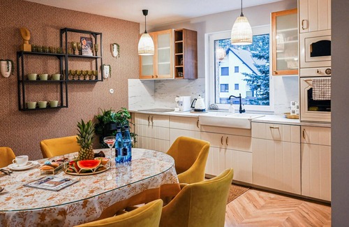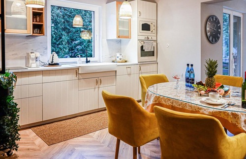 The comfortable vacation apartment awaits you near the Radunski Lake. With its individual, homely furnishings, it is the ideal place for a pleasant getaway near the Baltic Sea with your loved ones. Here you can relax in a stylish setting and enjoy a beautiful view of the outdoors through large windows in the living area.