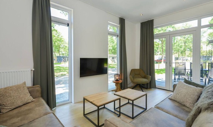Inside is the living room with an open kitchen, which is equipped with dishwasher, combination rowel, Philips filter coffee machine and Philips kettle, a great place to linger. The house has three bedrooms, one with a box spring double bed, one with box spring single bed and one with bunk beds. Modern bathroom and separate toilet. The holiday home is suitable for 6 people. As soon as the weather permits, you can stay on the private terrace with garden furniture and a large parasol outdoors. The garden around the pavilion is extensive and has a nice natural vegetation. The garden is also fenced so that you can enjoy a carefree time with your dog. Of course it is also ideal for young children. The singing of many birds completes the vacation picture! On our website you can discover the many options in and around the park to spend a wonderful vacation that your individual