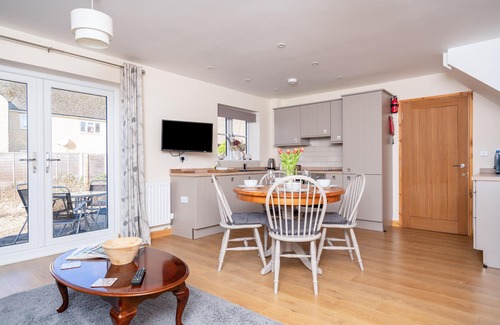 Downstairs is open plan with a well equipped kitchen area with electric oven and hob, fridge freezer, microwave, dishwasher, washing machine and tumble dryer. Sitting area, with comfortable seating and French doors to the patio. There is also a dining area.