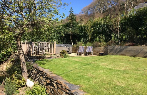The rear garden is enclosed and terraced on two levels, and care must be taken when approaching the edges of the terraces. Distant sea views from the hot tub!