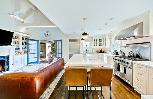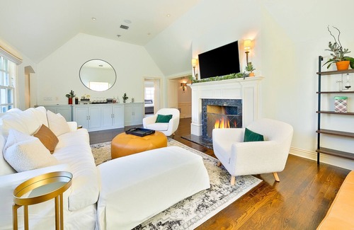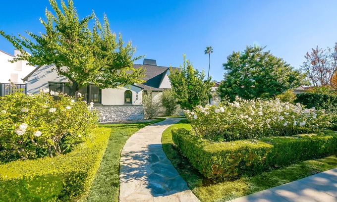 Nearly 100 years old and perfectly perched in the quiet Hancock Park neighborhood, this adorable Los Angeles retreat has been recently renovated with unmatched attention to detail while still retaining the understated glitz and glamour of the old Hollywood art deco motif. Just two blocks from a large grocery store and many shops/restaurants and a 15 minute walk to the famed Larchmont Village, Hancock Park Manor will greet you with a lovely garden and natural privacy created by lush greenery leading up to the front door. Look across the street and you will see the Cunningham homestead from 'Happy Days!' Step inside, and the contemporary touches, high-end furnishings, high ceilings, and abundance of natural light will allow you to slip right into relaxation mode feeling right at home. When it comes to entertaining the whole gang, the layout of the living room and kitchen is perfect for mingling from room to room as the chef of the group takes advantage of the gas range and stainless steel appliances provided. Kick back on the leather sofa in front of the fire and grab a book from the built-in bookshelf or stream a favorite movie on the mounted flatscreen TV to really chill out. When you need a bit of fresh air, step out of the french doors from the main suite or living area and gather around the firepit in the semicircular outdoor sofa as the sun goes down. Speaking of the primary suite, you can easily snag a bit of alone time and soak in the deep clawfoot tub or rinse off in the steam shower at the end of an exciting day. With so much comfort and style in a perfect location, you won't want to miss this rare opportunity!