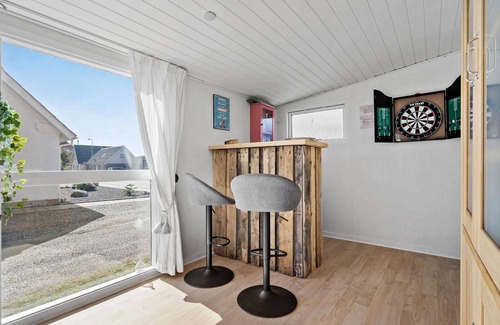In your holiday home in Bøvlingbjerg, you will find a stylishly furnished living area with a comfortable sofa as well as a rustic wooden design and brick elements that create a real feel-good atmosphere. Use the cosy room to read a good book or play fun board games. Gather for meals together in the modern dining area. For entertainment, there is a separate room with a dartboard and a small bar where you can spend your evenings playing a little tournament.