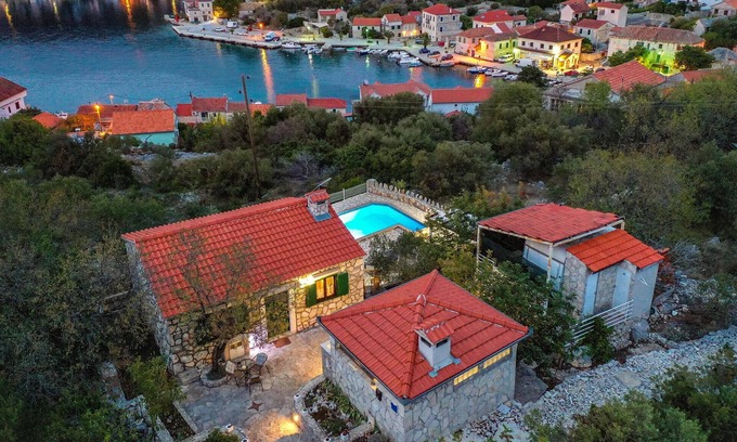 In an idyllic location on the island of Drvenik Veliki, lies this sunny vacation home with pool and stunning sea views. In front of the house, a covered summer kitchen and the garden table provide a nice setting for a maximum nature experience on this secluded island. The house is rustically furnished and ideal for couples or a family. Beach, supermarket, post office and restaurant are nearby. You will spend your summer vacation on the island of Drvenik, experiencing the Dalmatian lifestyle and listening to the chirping of crickets and the sounds of the sea.