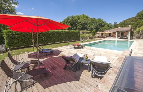 The spacious garden with pool and outdoor whirlpool promises you hours of relaxation. You can dine al fresco on the terrace and enjoy the picturesque surroundings. Watch your children play on the beautiful lawn while you laze on the sun loungers.