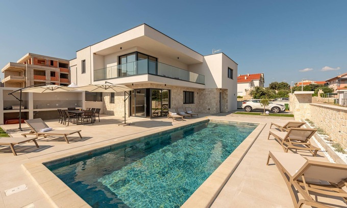 Your holiday in this stylish holiday home in Mandre promises you pure relaxation. The house impresses with high-quality materials and comfortable furnishings that leave nothing to be desired. The modern, tasteful furnishings create an inviting atmosphere that immediately invites you to feel at home. The spacious living area, with wood-burning stove, offers plenty of space for relaxation and socialising - perfect for a successful holiday in Dalmatia.