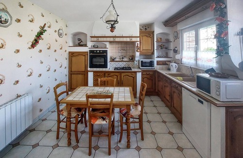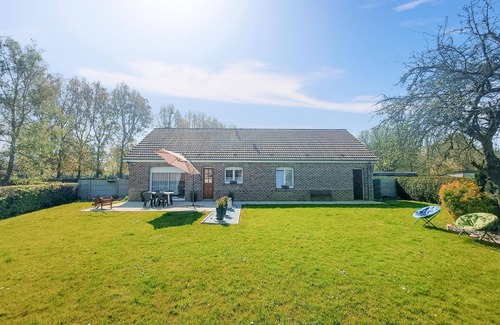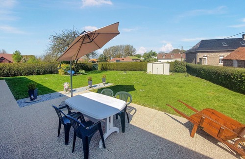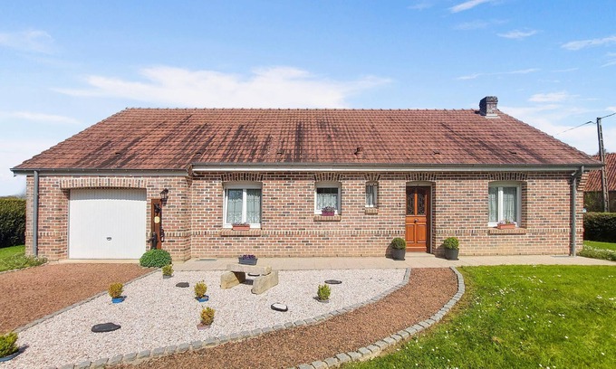 The house welcomes you in a small village in the Pas-de-Calais department. You can relax in the cosy rooms with furniture in a homely retro style and many charming details such as the special wallpaper. You can enjoy meals together in the living area with a beautiful view outside. The cosy seating area invites you to spend long evenings in convivial company at the end of an eventful day.