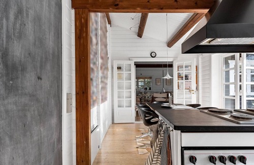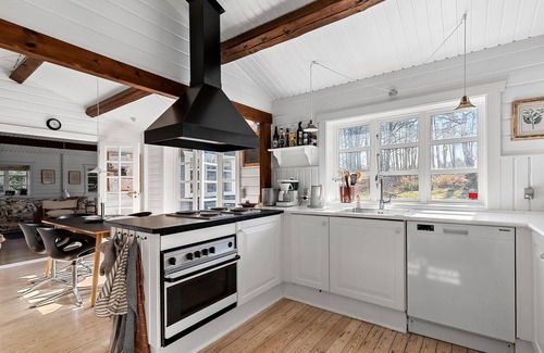 Your charming house combines Scandinavian clarity with the flair of traditional Danish summer houses. The light-flooded living area with exposed wooden beams on the ceiling and views of the countryside creates a cosy, feel-good environment. Delicious meals can be prepared in the modern kitchen and then enjoyed in a relaxed atmosphere at the dining table. In the evening, the wood-burning stove provides cosy warmth, ideal for cosy reading sessions or a glass of wine on the sofa. You can relax in the hotel's own sauna.