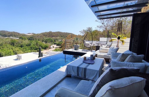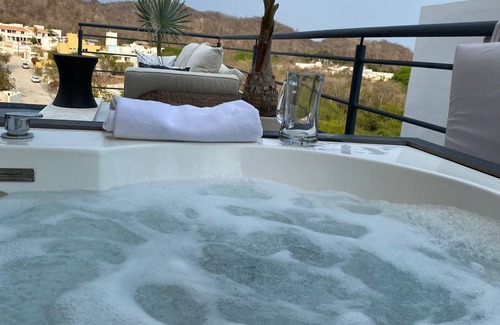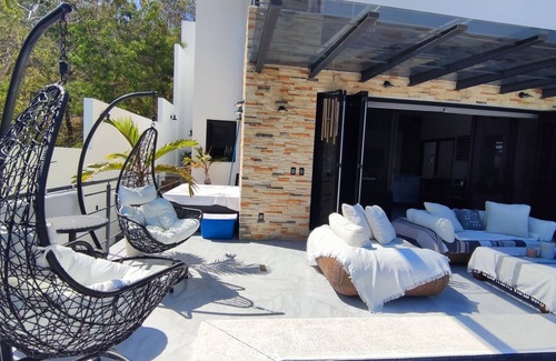 Beautiful recently built modern house with a fabulous infinity pool and an incredible hot tub, a beautiful terrace with views of the mountains to enjoy the sunrise, sunset, and starry nights, and just 5 minutes from the nearest beach in the paradisiacal Huatulco. It has a fully equipped kitchen, with a breakfast bar and a Smeg oven to bake everything you imagine without missing out on spending time with the rest of your loved ones thanks to the open concept that connects it with a living room with Smart TV and dining room which opens onto a terrace with pool, jacuzzi, sun loungers and stunning views of the surrounding area.