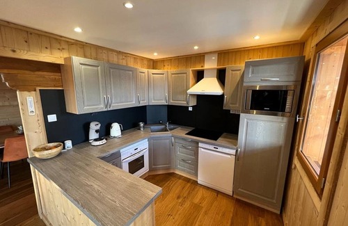 Very pretty chalet located on the heights of the resort in a quiet area with a superb view of the mountain range, the lake and the village of Les Angles