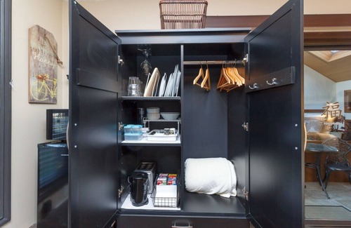 Cozy 15' by 15' room with queen size bed. Perfect for travelers flying in and out, work trips, and visiting. Ensuite bathroom with soaker tub and high toilet. Room has bar fridge, microwave, utensils, plates and glasses, coffee maker with coffee, tea, hot chocolate and hot cider, table and chairs, sitting area outside sliding glass door in enclosed, brightly lit private sitting area.