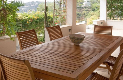 Villa Andromeda is a fully independent three bedroomed villa situated on a hill overlooking the sea, Genn'e Mari beach and the headland of Torre delle Stelle. The villa has spectacular sea views and is set in tranquil surroundings with an extensive terraced garden with Mediterranean plants and trees and a salt water swimming pool. Villa Andromeda comprises a large living room, independent fully fitted kitchen, one master bedroom with en suite bathroom, and a further two double bedrooms and a separate bathroom. There is a large outside terrace with panoramic views and tables and chairs for al fresco dining. The villa is fully air- conditioned. From the villa you can walk down the hill to the beach in 15 minutes or take the car (preferable for young children). There is a lovely safe beach for swimming, good restaurants, local village stores and plenty of activities in the vicinity. The location is less than one hour's drive from Cagliari airport.