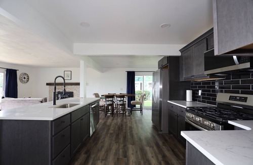 Our recently renovated home features 4 bedrooms and 2 full baths, plus 2 pull-out couches in the living room for extra sleeping space. Two bedrooms offer king-sized beds and flatscreen TVs, while a third bedroom has a cozy queen bed. The walkthrough bedroom is perfect for kids or groups, with three twin beds.