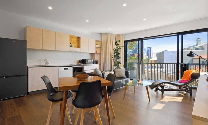 Cook with ease in the minimalist kitchen, complete with an induction cooktop, ovens, and built-in dishwasher. Share homemade meals or indulge in tasty local takeaways at the wooden dining table for four.