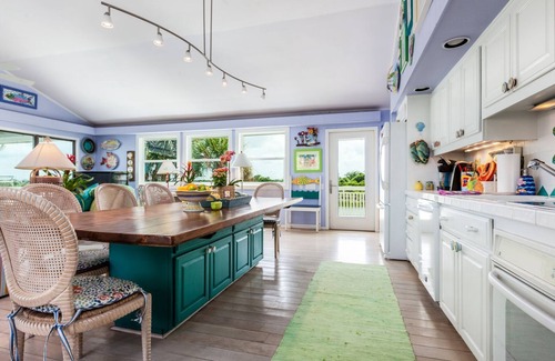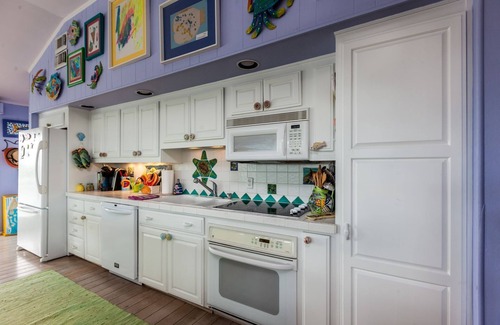 Inside, the home features modern updates and a calming coastal atmosphere. The ground level includes three private bedrooms—including a separate-entry bunk room—offering flexible accommodations for large families or multiple couples. Upstairs, you’ll find three additional bedrooms, including two King suites with en suite bathrooms. The open-concept kitchen, dining, and living area is ideal for gathering, and the kitchen comes fully stocked with extra cookware, making family meals simple and enjoyable.