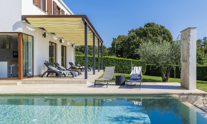 Modern villa "Luna Nera", 2 storeys. 6 km from the centre of Žminj, 13 km from the centre of Pazin, in a quiet, sunny position, 27 km from the sea. Private: property 1'000 m2, beautiful, well-kept garden with lawn and wildlife garden, swimming pool angular (10 x 5 m, depth 140 cm, seasonal availability: 01.Jan. - 31.Dec.) with internal staircase. Outdoor shower, pergola (30 m2), garden furniture, barbecue. In the house: internet access, washing machine, tumble dryer. Parking at the house on the premises. Shop 600 m, supermarket 6 km, restaurant 1 km, café 400 m, bus stop 6.6 km, railway station 500 m, pebble beach 27 km. Riding stable 7 km, walking paths from the house 1 km, cycle lane 1 km. Groups of teenagers on request only.