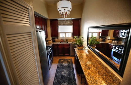 The kitchen is one of my favorite rooms with generous counter space and a full sink, oven and fridge; it's color scheme is bright and airy and the granite counters and tile floor are easy to care for. There is a long breakfast bar, a pretty chandelier and half shutters to let in the natural light.