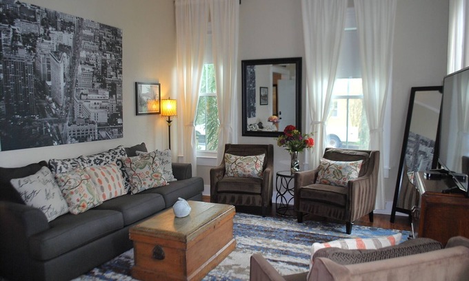 The living room has a new sofa and three new chairs. We have a 55" inch flatscreen tv in the living room with Apple TV (streaming netflix and hulu). There is a small patio area upon entering the house that you can use; it has a table and several chairs with many plants and flowers.