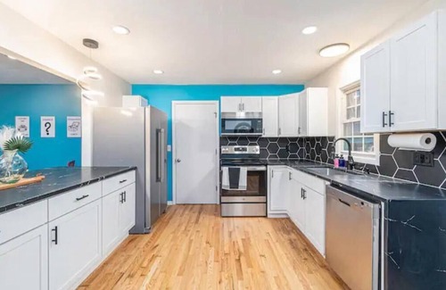 Kickback and unwind after a full day of work or travel at this modern, six bedroom home in Omaha, NE. Ideal for traveling professionals, group retreats, and large family getaways, this spacious home can be divided into three separate suites for additional privacy. Centrally located just steps from premium shopping, 9 minutes from CHI Health, and 13 minutes to downtown, this comfortable home has everything you need to make yourself at home in the “Gateway to the West”!