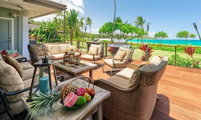 EXQUISITE FIND!! For those who appreciate the finer things in life, Kauai’s most beloved beach home, known as Ginger Beach House, is your slice of paradise! Indulge in this 5 star beachfront estate property as you bury your toes in pristine beach sand. Whether you’re seeking a relaxing or an adventurous vacation experience, this stunning four-bedroom, four-bath, 2800 SF single level vacation hideout is the perfect home away from home where you will enjoy a local Hawaiian beach setting. This estate is known to be the most expansive and luxurious property in the area and boasts 152 feet of beach frontage and a 2500 SF ocean facing lanai running the full length of the home. Soak up sweeping white sand beach and turquoise blue ocean views from all living spaces and every bedroom. Ideal for up to ten guests. The property is ideally located next to a public beach park containing a lifeguard station and public bathroom. The home was built with immense attention to detail and is lavishly stocked inside and out to include beach amenities. This is one of the few homes on the island with AC. On mild days, open the jalousie windows and take in the Pacific breezes coming right off the beach! This home includes a flat screen TV, high speed WIFI and a Bluetooth-ready Stereo. We have over 100 exceptional reviews for this property across our hosting platforms with an average review of 9.9. Crack open a coconut and take a load off. You deserve it!!