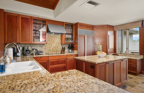 The gourmet kitchen also has a fabulous ocean view, and is fully equipped with top tier appliances, gleaming granite countertops and smooth wood paneling. A countertop bar with 4 barstools invites casual conversation during meal preparation. Floor to ceiling sliding glass pocket doors open from the great room to a large covered lanai (porch) with a regal dining table set for 6. It also includes an outdoor barbecue grill, perfect for BBQing freshly caught Ahi or Mahi Mahi, and two chaise loungers, facing west towards the private back yard and ocean beyond.