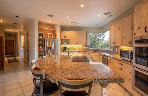 Escape to this luxury villa located in the private Cahuilla Hills neighborhood in Palm Desert, CA. Enjoy the extraordinary sunrise views of the Coachella Valley from your bedroom or upstairs patio and the majestic sunsets that fall behind the mountains while you're enjoying the backyard when dining, swimming, play horseshoes, putting on the green or sitting around the fire. The entire villa is privately yours. As you arrive to this luxurious grand circular driveway with a beautiful desert landscape. BACKYARD: Is the perfect desert escape with a private pool and spa, fruit trees, horseshoe pit, putting green, secluded lounge and fire pit, outdoor dining, lounge by the fire on the patio as you watch your favorite TV show or host an amazing event or wedding on the massive lawn space that is surrounded by trees and desert landscape. As the sun goes down the bistro string lights give the most amazing ambiance as it lights up the entire backyard. The bird life is EPIC, and the native flora is fascinating. There is another house being built next to us. It does not detract from your privacy and need for quiet. Also, there is a PELETON here, should you be a fan. INSIDE: The upstairs has 1 bedroom and 1 bathroom with a private patio that looks over the Coachella Valley. Downstairs you can enjoy one of the 3 seating areas. In the morning room drinking your coffee, in the grand room or the main open seating area that looks out to the beautiful backyard. A king dining table that seats 12 and a gorgeous kitchen that you can enjoy the views of the valley. 2 large bedrooms with king beds, 1 bedroom with 2 queen beds and a private office with a queen murphy bed. Full access to the property. You have 24/7 care throughout your entire stay Cahuilla Hills – Located three miles southwest of Palm Desert off Highway 74, near Bighorn Golf Club. At 932 feet above sea level, it consists of 632 homes that literally come in all shapes, and sizes. Only minutes away from El Paseo, shopping, dining and entertainment. The house has a large circular driveway and an extended driveway that goes up to the garage.