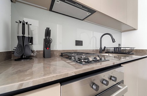 Fully-equipped with modern appliances including a freezer, microwave, toaster, oven, refrigerator, gas stove, and Nespresso coffee machine. Perfect for quick breakfasts or gourmet dinners.