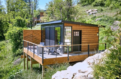 Modern architecture meets mountaintop experience in our Luxe Glass Cabin. Wake up to the sunrise at 4,000 feet from your private hot tub or king size bed as it pours in through your 8’x 16’ glass wall that opens up to let the outside in. (blackout curtains too). Step outside onto your private deck with a fire table while taking in the fresh mountain air. Includes a luxury bathroom with a tile shower for 2, and well equipped kitchenette. Near by is our community area with a large fire pit and bbq