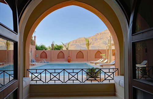 Relax in the suite\'s living area, featuring a cozy sofa, desk, mini-fridge, TV, and kettle, all curated to make your stay as comfortable as possible. The balcony opens up to serene garden views and the grandeur of distant mountains. Venture to the communal lounge and rooftop terrace for panoramic views of the desert landscape, including the Habu Temple and the Valley of the Queens.