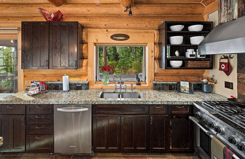 Pine Hill is a six-bedroom, 4.5-bath decked-out custom log home with stunning views of the surrounding mountains. No detail in this modern-yet-rustic home has been overlooked. You’ll find high-end appliances, the softest sheets and towels, and stylish decor at every turn. There are endless ways to have fun, including a game room with shuffleboard; a stone fire pit surrounded by Adirondack chairs and a bubbling brook; a hot tub with sweeping mountain views; an outdoor cedar sauna; decks and patios complete with outdoor furniture, a gas fireplace, and a grill for casual dinners; even a treehouse!