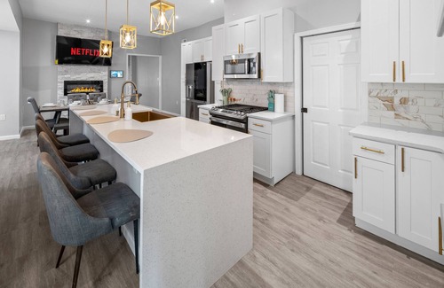 Recently upgraded and beautifully furnished throughout, this private three-bedroom home features an open floor plan with luxury finishes, gourmet kitchen, counter-height seating, dining area with 60" Smart TV, designated workspace, and living room with 65" Smart TV.