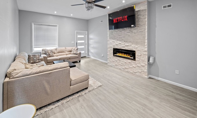 Spacious living room includes a comfy sofa, 65" Smart TV, laundry area, electric fireplace, front porch, free high-speed Wi-Fi, on-street parking, and keyless access.