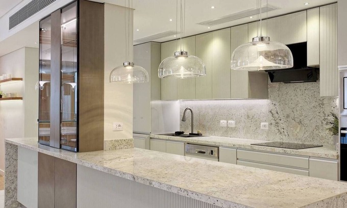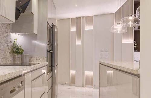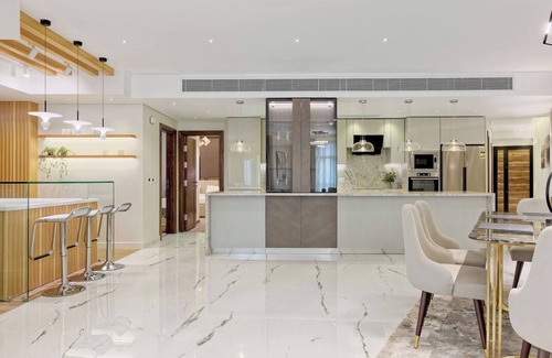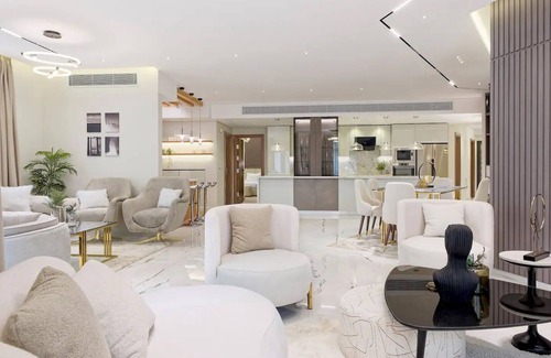 The apartment also features a fully equipped kitchen, a stylish reception area, and a sophisticated dining room.
