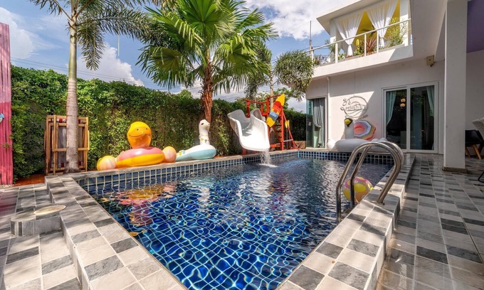 This villa is ideally suited to a small family group or a group of friends, seeking luxury and privacy in a perfect location and at reasonable prices, ensuring a comfortable and elegant stay. Enjoy utmost privacy and indulge in the serene ambiance of our property. Step onto the amazing terrace on the rooftop also there is a lovely large bedroom, surrounded by mountain view for you to relaxing, adorned with an outdoor player such as slider, ring floats etc, a sparkling pool, and a outdoors jacuzzi, creating a tranquil paradise for your relaxation. Not far from the villa, attractive family activities such as buddha mountain, vineyard, Ramayana waterpark, cartoon Network waterpark, Nong Nuch tropical garden.