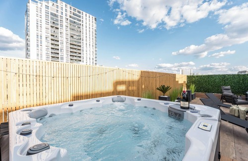 Be among the first guest to ever visit! Discover modern luxury and calm in this brand-new designer apartment with a 90m² private terrace and bubbling jacuzzi (up to 40°C all year) 🌿 Perfect for couples, city breaks, or remote work vibes.