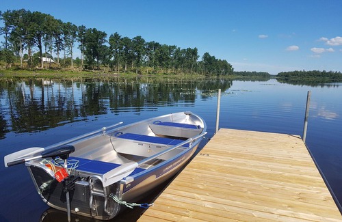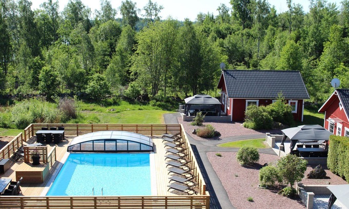 Stay comfortably near the water. Luxury cottages with lake views and heated swimming pool outside the door!By "Semesteroas Fiskestadssjön" is ment a small and familiar holiday village, consisting of two cores with five identical holiday homes each, arranged around two heated outdoor pools. The cottages are recently renovated in 2021 and have a fantastic location in the South of Småland with a view of the lake Fiskestadssjön which is rich in fish.Perfect solution for your planned family holidays with a lot of possible activities on-site. There live also animals like cows, pigs, pony goats or alpacas which you as a guest can marvel at and feed.The holiday village has two groups of houses located next to each other, each with a pool area. The cottages 1-10 are about 70-75 sqm and have 6 beds and two extra beds in each cottage. All houses have a brand new patio with barbecue and comfortable outdoor furniture under a pavilion, paved corridors between the houses, brand new pool areas, walkways by the lake and a boat with electric motor to each cottage.All houses have lake views and are close to 2 fenced pool areas with large pool deck, patio furniture and sun loungers. The pools are heated and covered with glass roof.You have a have wc & shower, kitchen and open plan living and open up in nock. 3 bedrooms (one of these bed loft) with 2 single beds in each bedroom and sofa bed in the living room.The kitchen is fully equipped with stove / oven, fridge / freezer, dishwasher, micro, crockery, kitchenware.Satellite TV and swedish channels are available in the house. You have your own patio with 8 chairs and a large table under a pavilion. On the patio there are charcoal grill and sun loungers.There are both a beach volleyball field and large areas of lawn for any kind of fun and games at the complex. You can go on a trip, for example, to the zoo on Öland, the Western town of High Chaparall, Barnens gård (adventure park for children), Kreativum or Astrid Lindgren´s World.Fiskestadssjön is famous for its large perch and pike. You can do fishing from both land, dock and boat. Nearby is Lake Åsnen, which belongs to Sweden’s top 10 fishing. There are fishing guides and night fishing on the goose!Mörrumsån is also available as an option for those who want to fish in water.