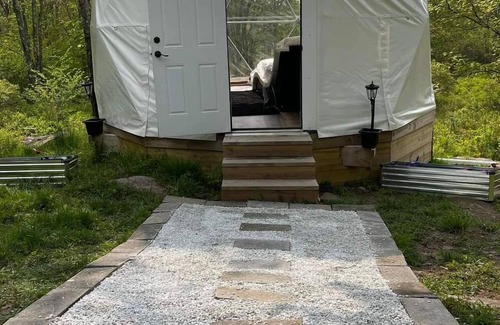 As you arrive at our tranquil 14-acre wooded sanctuary, the crisp mountain air welcomes you, carrying the soothing melodies of rustling leaves and birdsong. Your private oasis awaits, featuring a beautifully appointed canvas tent outfitted with all the comforts of home.