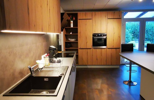 Layout: Ground floor: (Kitchen(dining table, cooker, 2x coffee machine(cups, filter), oven, microwave, dishwasher, fridge), Living/diningroom(TV, stove(wood), phone docking station), bedroom(double bed(160 x 200 cm)), bedroom(3x single bed(90 x 200 cm)), bedroom(2x single bed(90 x 200 cm)), bedroom(double bed(140 x 200 cm)), bathroom(shower, washbasin), bathroom(shower, washbasin, toilet), toilet, recreation room(table tennis table, table football, billiards), pantry(fridge, freezer)) garage, fireplace, washing machine, patio, heating(central, oil), terrace(roofed), terrace, garden(fenced), bicycle storage, garden furniture, sun loungers, BBQ, parking, deckchairs, parasol, children's bed, high chair, ironing board, party games