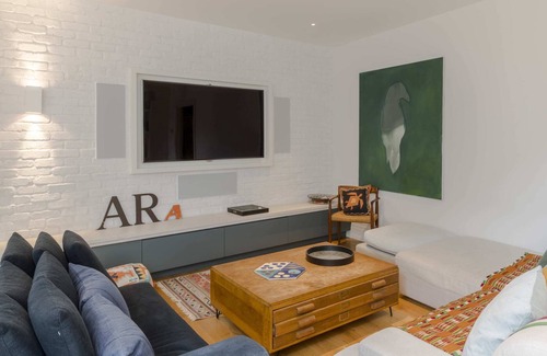 Below ground level, our cosy media room awaits. It provides the perfect setting for movie nights, equipped with a large TV and comfortable sofas. Nearby, the peaceful, light-filled designer studio space is at your disposal, with a large table, workspace, and skylights that bathe the room in natural light from the garden above. Our functional utility room, complete with a washer, dryer and a warm clothes hanging area, makes laundry chores a breeze.