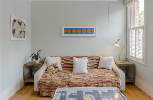 Past the snug, you’ll find a culinary oasis in the form of our modern kitchen. This chef's paradise has three Miele ovens – a steam oven, a microwave combination, and a 90cm wide conventional oven. Adjacent, a full-height fridge, freezer and wine fridge stand ready for use. A boiling and cold filter tap has also been fitted for ultimate convenience. Connected to the kitchen, the dining room lies within a contemporary, light-filled house extension. Admire the mid-century Danish table that expands to accommodate 10 guests, with highchairs and toddler seats available for your youngest companions.