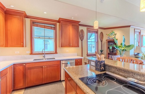 Our Kolea gourmet kitchen is a chef’s dream with high end stainless appliances, granite counter tops and everything you need to cook, spices as well. Open plan with 3 bar stools at the counter.