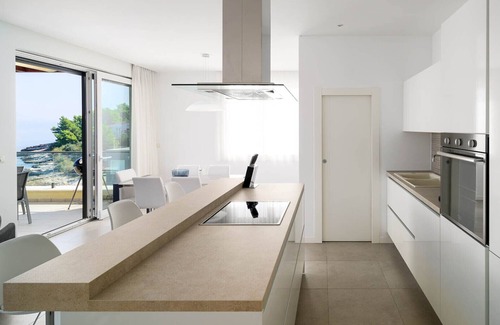 This superbly decorated and elegant villa is part of a newly built luxurious beachfront complex Golden, situated just 10 m away from the beautiful pebble beach and crystal clear sea with a stunning panoramic view of the coast, mountains and the city of Split.
