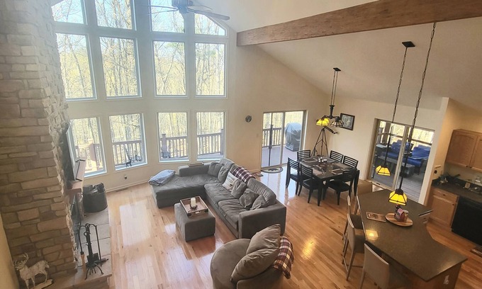 The Chalet has a spectacular wall of windows, a cozy wood burning floor to ceiling stone Fireplace, Outdoor Firepit, Large deck with large propane grill, Screened in Porch with comfortable chairs and propane Fire Table to hang out and enjoy the outdoors, Pool Table / Ping Pong Table / Air Hockey Table, Dart Board, poker chips and 2 large smart TV's. There is a Loft area which is great space to relax with a daybed and lounge chairs. The Loft also has a dedicated Office Space with desk, monitor, keyboard, printer, etc.