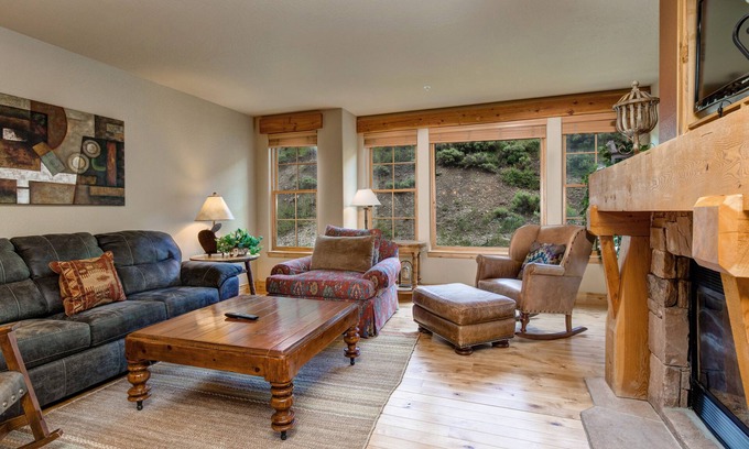 This premier, quiet, ground-floor, timber and red-rock condo is nestled in the back next to an open hill, with a private outside covered patio. Conveniently situated at the base of Deer Valley Resort, you are close to everything: Deer Valley Resort, Park City Mountain Resort, and Main Street/Old Town. And with Park City’s free bus route just steps from your door, you can easily get to the resorts and anywhere else in town, with or without a car. This premium first-class condominium with an on-site restaurant offers a custom king bedroom suite, two bathrooms, and a sofa bed, as well as an open layout, stylish, mountain-modern/rustic furnishings, hardwood floors, and a natural-stone gas fireplace. The well-equipped kitchen has ample space throughout to dine and relax. The ideal location for a memorable vacation! Free WiFi, DirecTV, and DVD player.