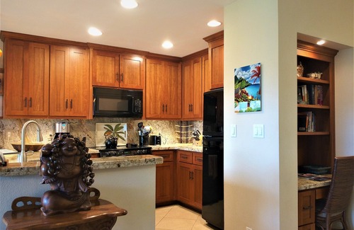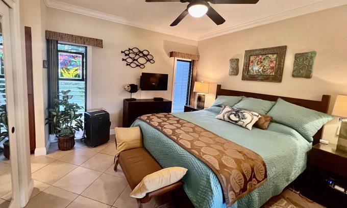 The BBQ grills, pool and tennis courts are all closely available for your enjoyment. In the event the usual refreshing trade winds die down, you’ll sleep comfortably with our bedroom A/C unit. We’ve also added a lanai fan over the patio table along with some ambient rope lighting.