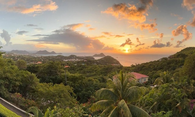 Welcome to the Guest House at Residence Du Cap with breathtaking panoramic views of the entire Caribbean coast of St Lucia. Nestled on just under a acre of private lush tropical vegetation, the estate sits on the side of a mountain in Cap Estates with views of the famous Pigeon Island to the great Pitons. Only sunsets every afternoon, so make use of our blender and sip your favorite tropical drink and enjoy the views and sounds of nature. Residence Du Cap consists of a one bedroom self contained guest house which is two levels. the 2nd floor is a one bedroom with private balcony, Air conditioning and ensuite bathroom and walk in closet. All rooms have stunning views of the entire coastline. Relax with the whole family at this peaceful place to stay. The main floor is an open concept with living room, kitchen, working desk and Starlink satellite for your high internet needs. Indoor and outdoor dining along chaise lounge chairs and shared pool with a view to die for. Equipped with both a gas and charcoal BBQ for all your grilling needs. Fully fenced and secure with monitored security. The host stays in the main house with his family and two small dogs. Residence Du Cap is a 5 minutes drive to the famous Pigeon Point Beach and less than 10 minutes away from Rodney Bay. We are also 5 minutes away to some the most famous golf courses in the world.