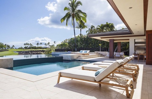 Pohinahina Place is your private resort retreat. With an incredible view of the Pacific Ocean and overlooking the 5th green of the Hualalai Golf Course, this property is located right in the middle of Hualalai Four Seasons Resort. This beautiful oasis is nestled on a cul-de-sac, has a private pool and spa and is a luxurious, serene getaway perfect for all types of groups including families.