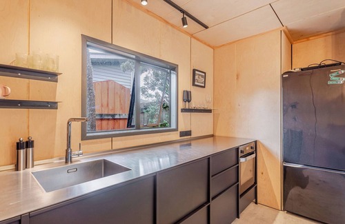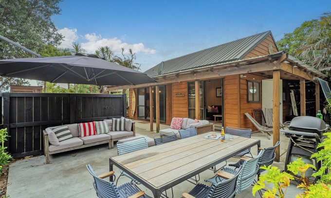 Created by a registered architect and interior designer, the property blends luxe simplicity with a warm, casual vibe. The main house features a designer black steel kitchen, airy living and dining spaces, a sleek new bathroom with twin basins, and a separate outdoor-access toilet and an outdoor shower to rinse off after the beach — perfect for beach days. Inside, you'll find curated vintage and local New Zealand furnishings alongside original art and unique touches throughout.