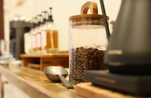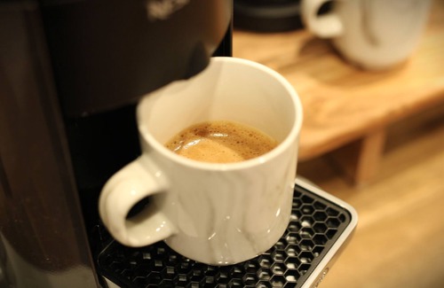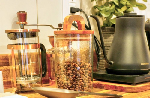 If you head up the stairs to the main floor, you’ll be greeted by stones walls leading into a full kitchen including a built in nook dining area and coffee bar that is built for the coffee connoisseur! There is a Nespresso Virtuo espresso machine with pods and a milk frother (milk not provided) so you can make yourself a latte, cappuccino, iced coffee or just a shot of espresso to get you going! For the traditionalist there are fresh coffee beans with a grinder, french press, and electric kettle; an array of delicious flavored syrups and creamers, and for the non-coffee drinkers, an assortment of teas.