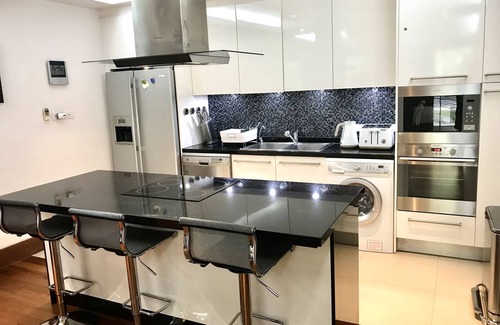 Open plan european kitchen with an island. Amenities include american style fridge freezer, oven, microwave, dishwasher, induction hob, washer/dryer, wine cooler, toaster, kettle, Nespresso machine, egg boiler, blenders, sandwich maker and modern style accessories.